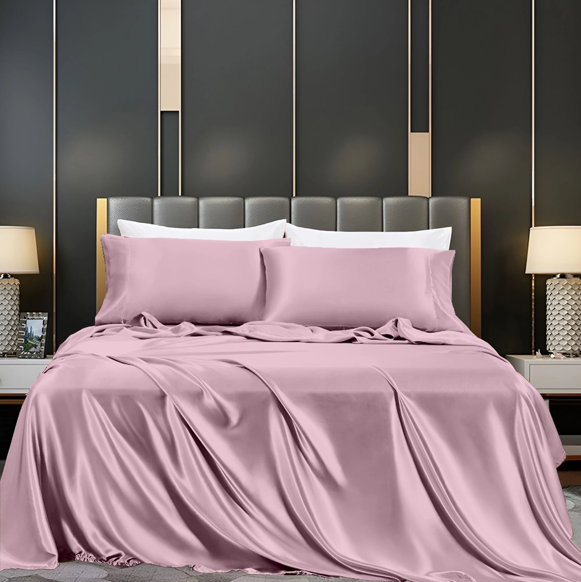Experience the ultimate in bedroom luxury with our Silky Comfort Shimmer Bedsheet Set. Made from premium satin fabric, these sheets offer a silky soft texture and a subtle shimmer that transforms your bed into a haven of comfort. The smooth surface glides against your skin, providing a cozy and inviting sleep environment fit for royalty.